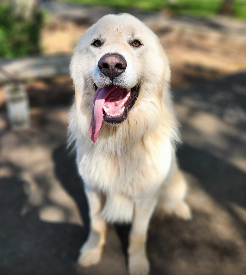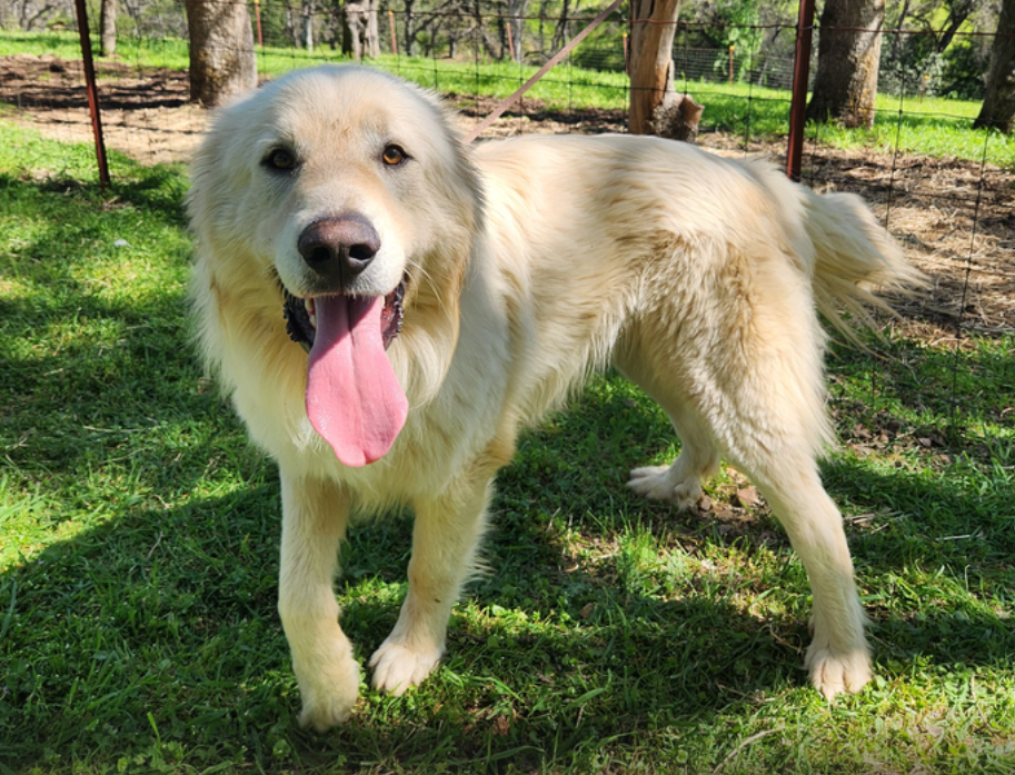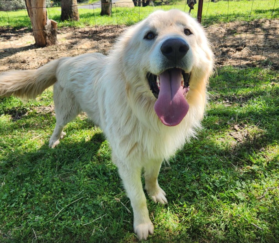Clover is about 100 pounds of pure love and sweetness. This handsome Great Pyrenees is the definition of a gentle giant—calm, kind, and wonderfully good with everyone he meets. True to his livestock guardian roots, he’s excellent with other animals, including cats, birds, and even interspecies friends.